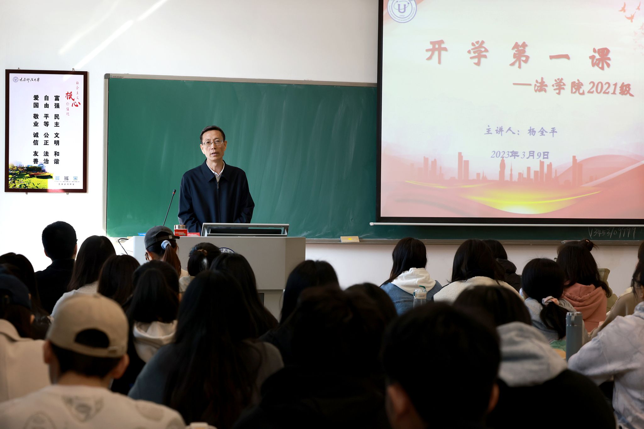 校党委副书记杨全平从“自信·挑战新时代”和“青年大学生应该肩负起的时代使命”两方面为法学院学生讲授“开学第一课”。他以中华民族伟大复兴战略全局和世界百年未有之大变局“两个大局”为切入点,系统分析了中国特色社会主义新时代我国发展所面临的重要机遇和挑战,勉励广大新时代的法学生更要充分发挥自身专业优势,努力成为法治国家建设所需要的尖端人才。