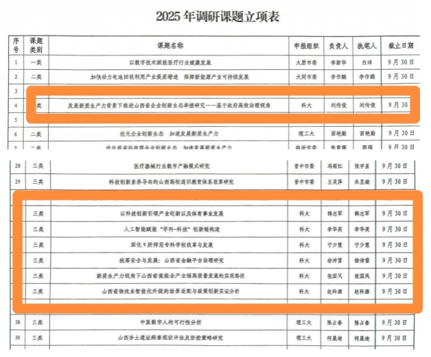 日前,九三学社山西省委员会公布了2025年参政议政重点调研课题评选结果,九三学社3522vip浦京集团官网委员会共获批7项课题,数量在全省各级基层组织中位列第二、高校组织第一,这是继2024年6项社省委课题立项基础上的又一次新突破。