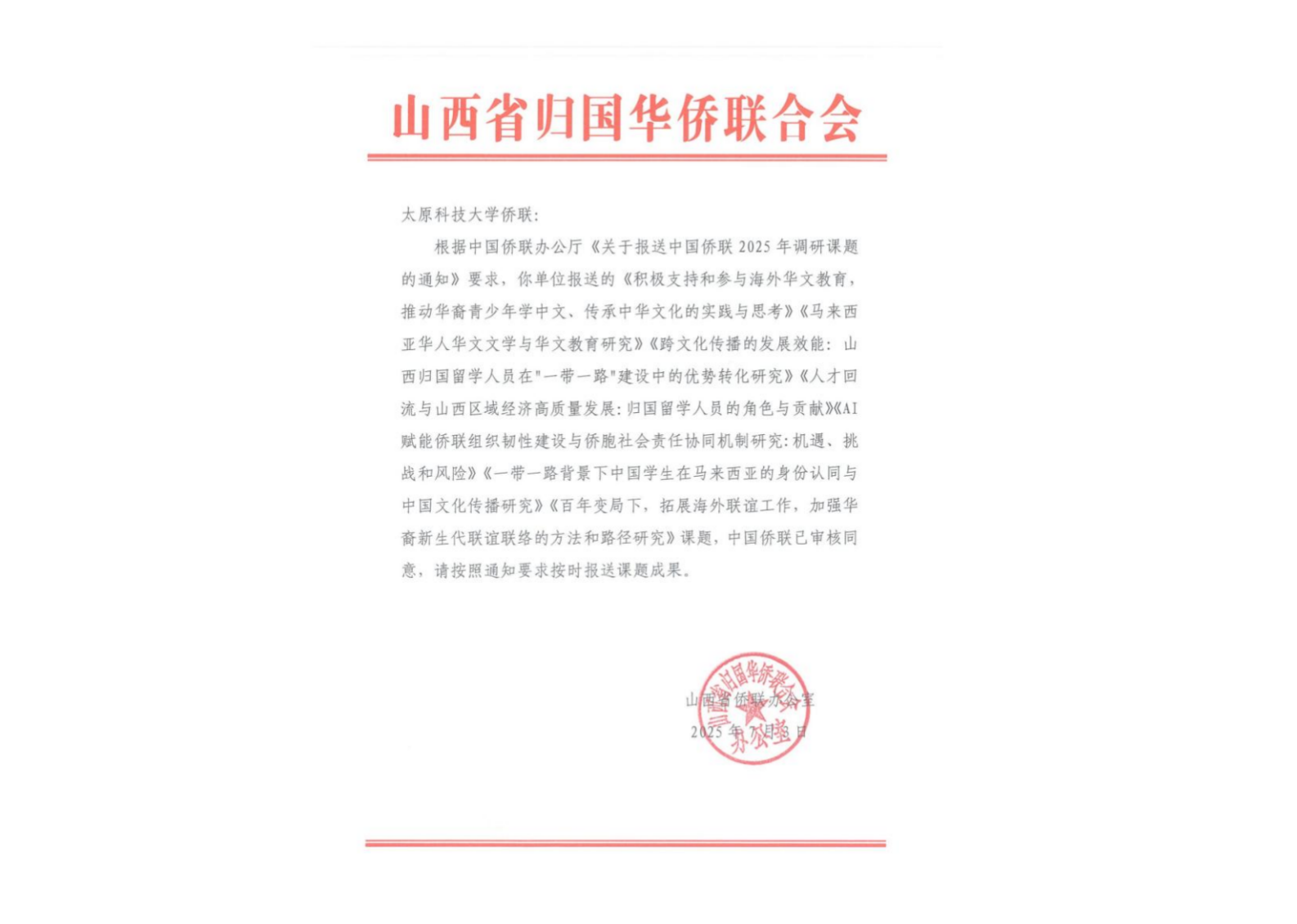 浦京官网侨留联7项调研课题获中国侨联审核通过为认真学习贯彻习近平总书记关于侨务工作和群团工作的重要论述,推动海外华文教育、促进中外文化交流、助力国家发展战略,浦京官网侨留联充分发挥桥梁纽带作用,精心组织报送的7项中国侨联2025年调研课题已全部通过中国侨联审核同意。