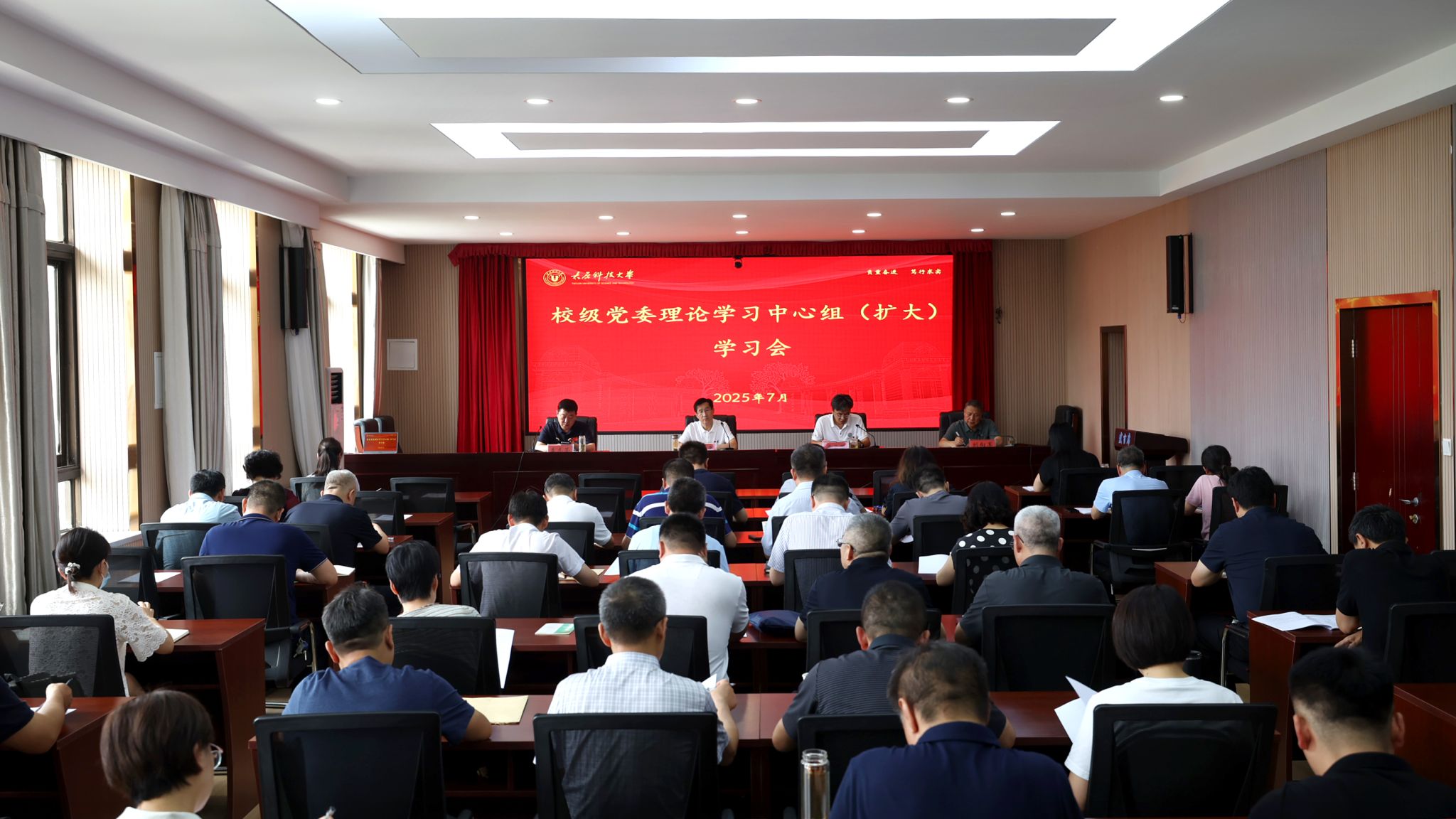 7月7日下午,浦京官网在主楼4层会议室召开校党委理论学习中心组(扩大)学习会,校党委书记白培康主持会议并讲授深入贯彻中央八项规定精神学习教育专题党课。校党委理论学习中心组成员、全校正处级干部、年轻干部代表参加。