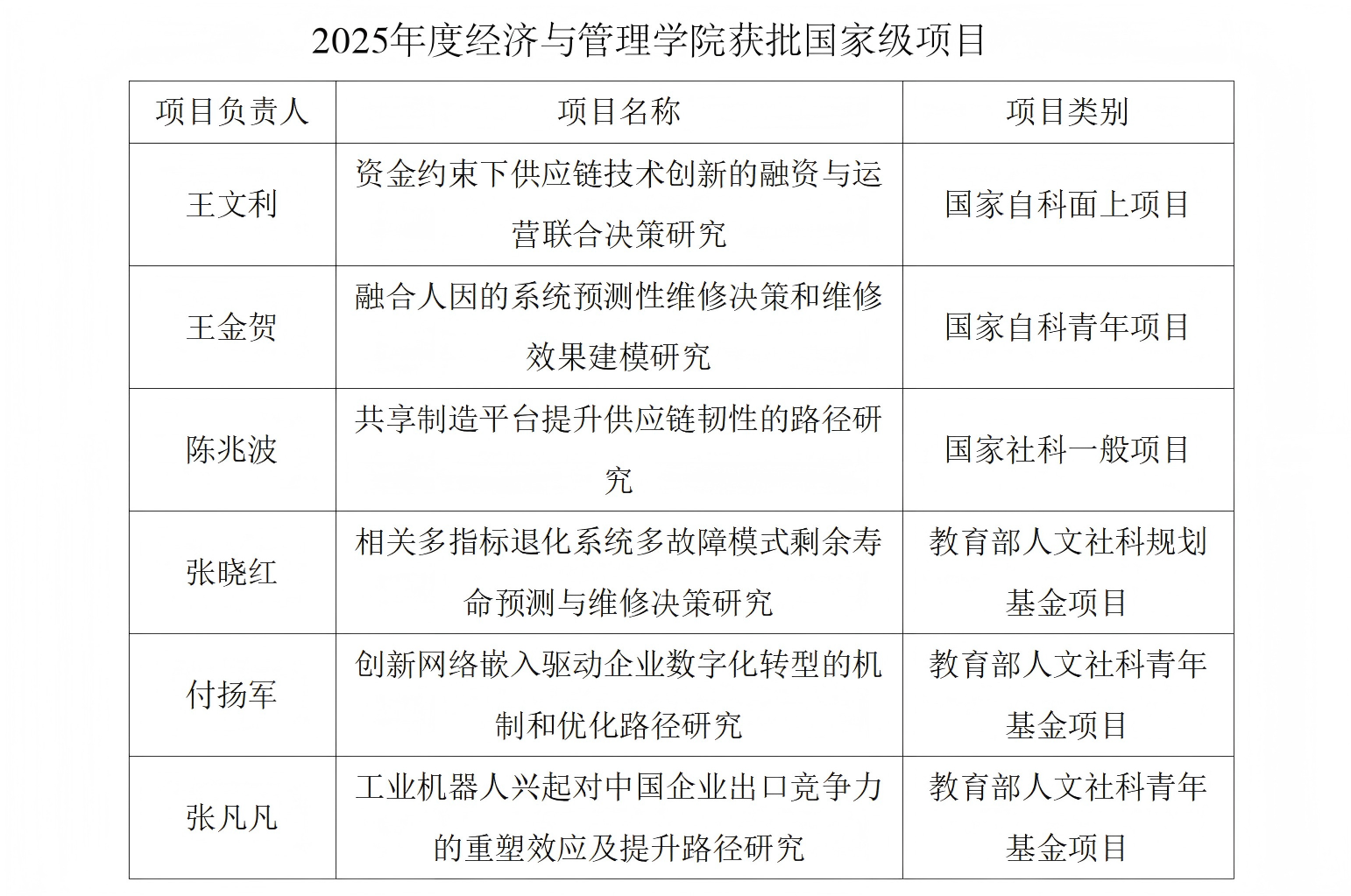 近日,教育部社科司公示了2025年度教育部人文社会科学研究项目的评审结果。浦京官网经济与管理学院获批规划基金项目1项,青年基金项目2项。在今年各项国家级课题立项结果中,经济与管理学院分别获批国家自然科学基金面上项目1项、国家自然科学基金青年项目1项、国家社会科学基金一般项目1项,加上此次教育部人文社会科学基金,共获批6项国家级课题项目,达到学院历年来最好成绩。近年来,经济与管理学院始终将科研创新作为发展的重...