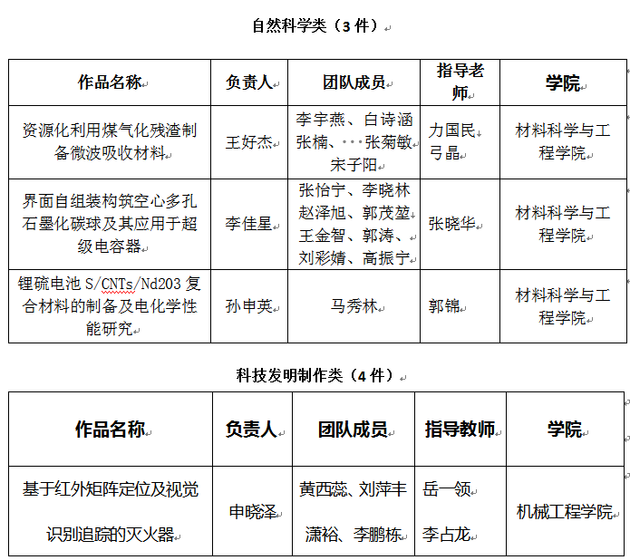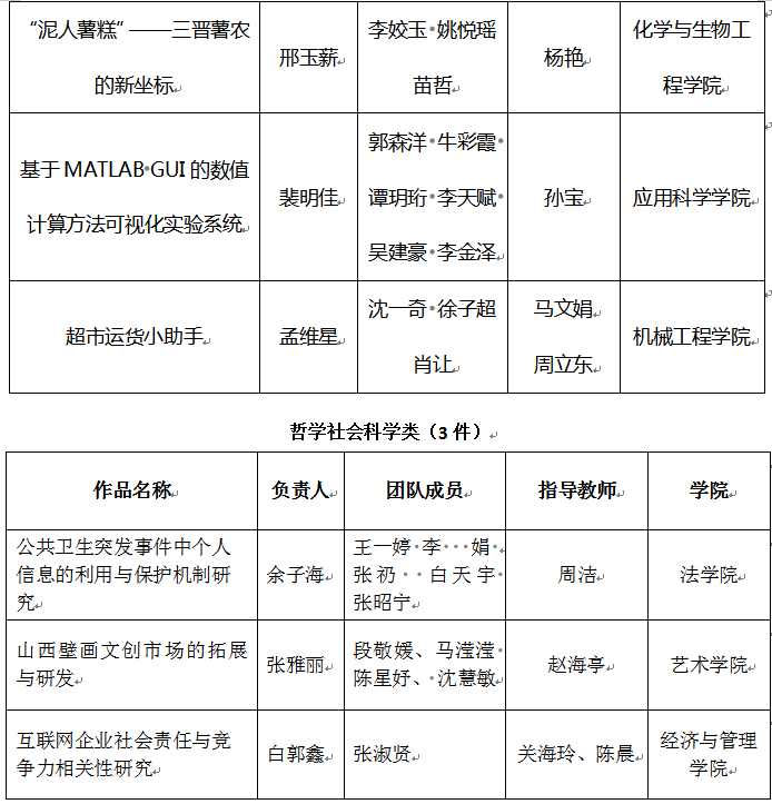按照《关于组织开展山西省第十七届“兴晋挑战杯”大学生课外学术科技作品竞赛3522vip浦京集团官网校级赛事的通知》,校内17位专家经过3月30日—4月1日的紧张评审,评选出浦京官网晋级省赛的10件作品,现将作品名单公示如下: