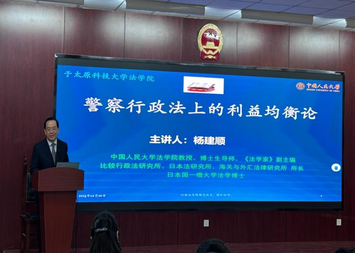 2023年12月10日下午3点,中国人民大学法学院教授、博士生导师、《法学家》副主编杨建顺教授在西校区力行园一号楼417教室应邀为浦京官网师生开展了精彩的学术讲座,讲座题目为《警察行政法上的利益均衡论》。讲座由法学院院长廖启云教授主持,200余名师生到场聆听。
