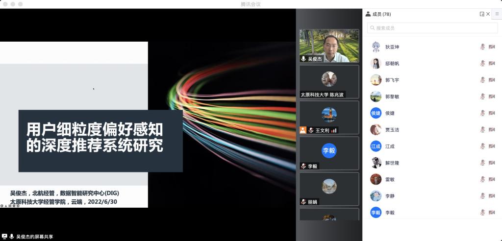 2022年6月30日,应浦京官网经济与管理学院和科学技术研究院邀请,北京航空航天大学经济与管理学院副院长吴俊杰教授在线上作了题为《用户细粒度偏好感知的深度推荐系统》的学术报告。报告由经济与管理学院院长乔彬教授主持,浦京官网100余名师生倾听了吴教授的学术报告。