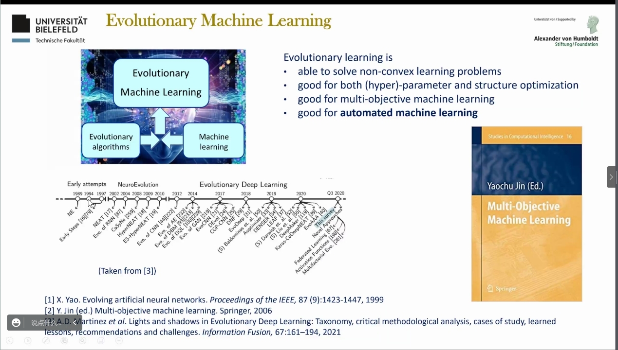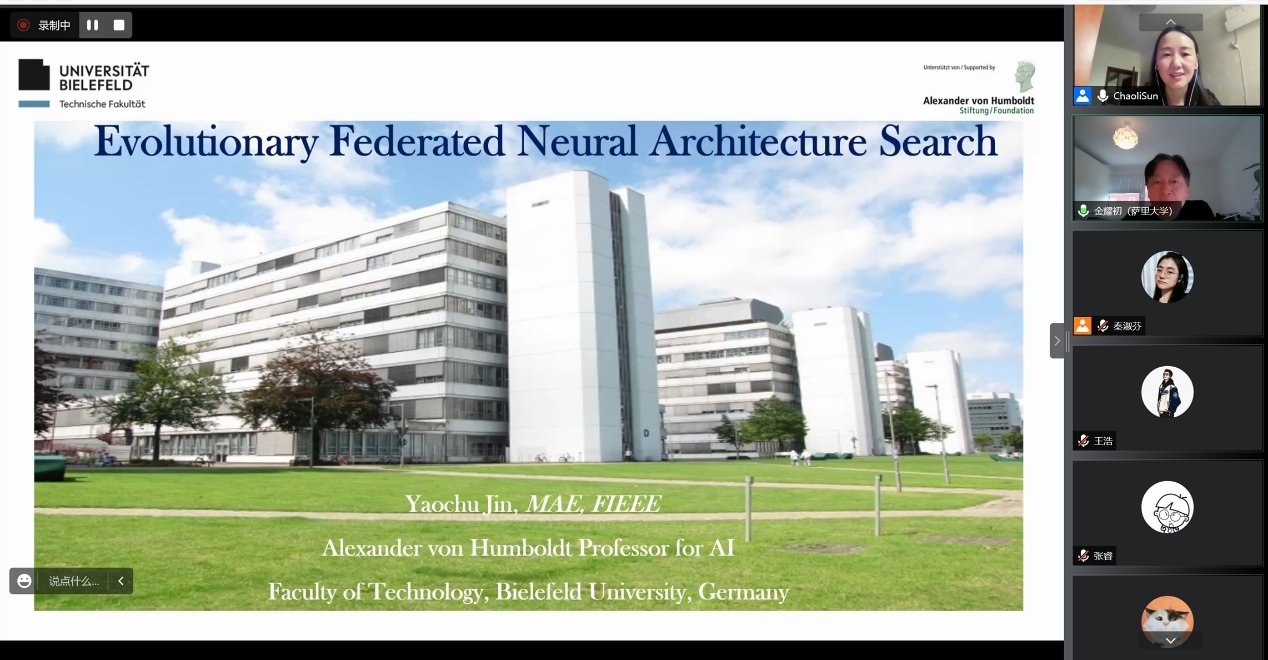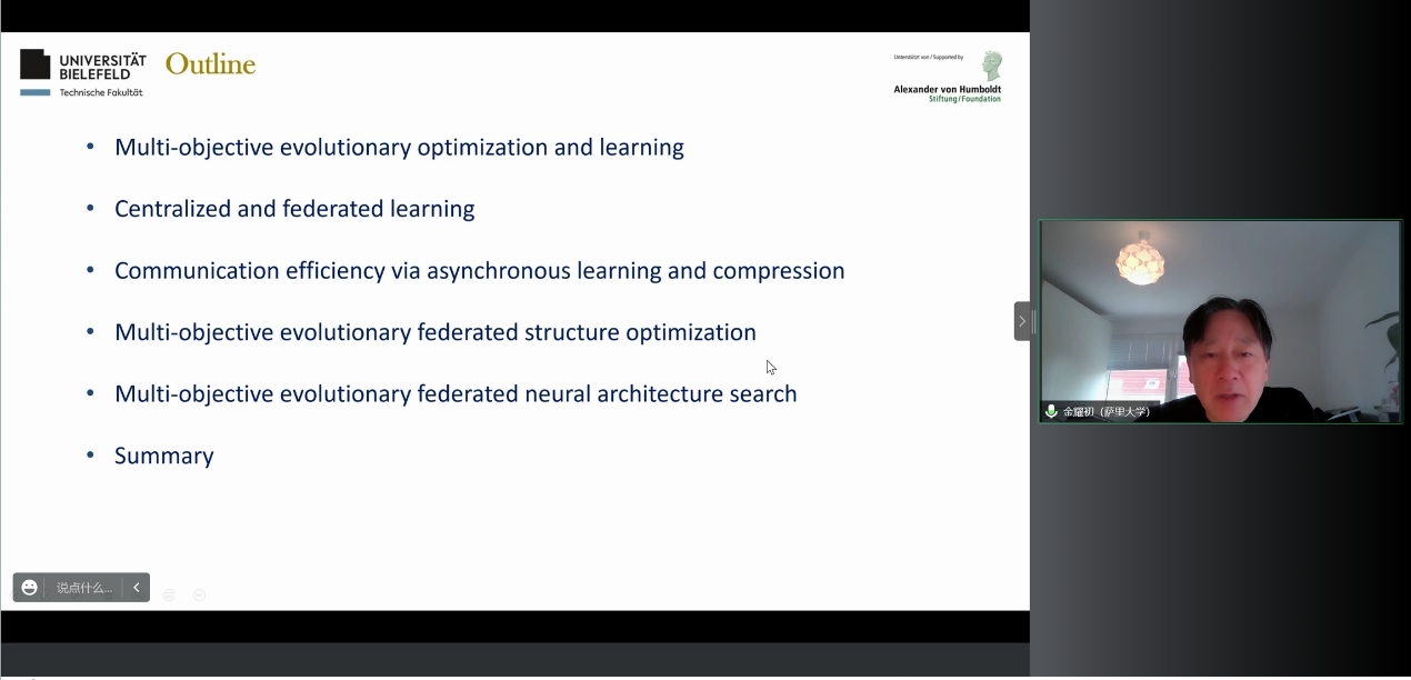 神经网络架构搜索是迈向自动化机器学习的重要一步,能够通过学习或优化过程设计深度神经网络。然而,当训练数据分布在多个站点并受到隐私保护时,寻找最佳神经网络架构的研究还不多。本次报告介绍了两种最新的算法,可以通过使用多目标进化算法执行神经架构搜索。本项研究的重点在于高效表达深度神经体系结构、处理学习过程中的多个目标以及降低神经网络架构搜索过程的计算复杂性。最后,金耀初教授对进化联邦网络架构搜索在实际中的未来应用发展趋势进行了展望。讲座结束后,在线师生进行了热烈的讨论。