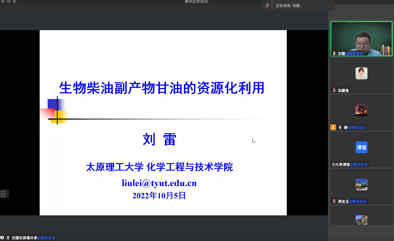 2022年10月5日,应化学工程与技术学院和科学技术研究院邀请,太原理工大学刘雷教授在线上做了题为《生物柴油副产物甘油的资源化利用》的学术报告。报告由化学工程与技术学院副院长张静副教授主持,浦京官网90余名师生在线上倾听了刘雷教授的学术报告。
