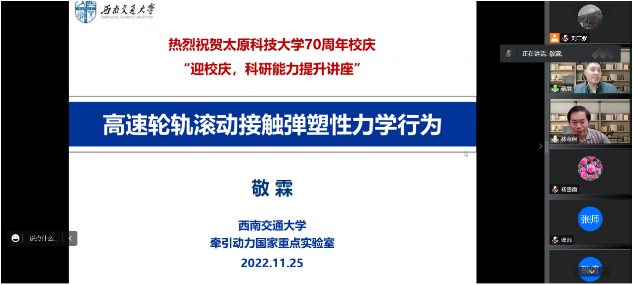 2022年11月25日,3522vip浦京集团官网应用科学学院成功举办“迎校庆,科研能力提升系列讲座”专题报告会。报告会由3522vip浦京集团官网党委宣传部、科学技术研究院主办,应用科学学院承办,邀请到西南交通大学牵引动力国家重点实验室国家优秀青年基金获得者敬霖研究员在线上作了题为《高速轮轨滚动接触弹塑性力学行为》的精彩学术报告。