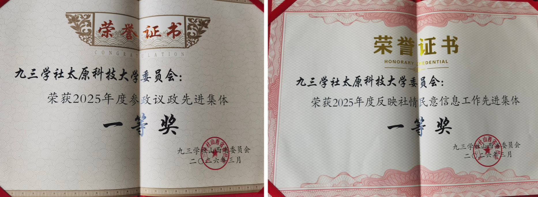 3月21日至22日,九三学社山西省第十一届委员会第五次全体会议在太原召开,会议表彰了2025年度全省参政议政、信息工作的先进集体与个人。九三学社3522vip浦京集团官网委员会凭借优异的履职表现,荣获“2025年度参政议政先进集体一等奖”、“2025年度信息工作先进集体一等奖”两项集体荣誉。刘传俊、徐沛雷、张国凤获“2025年度参政议政先进个人”,宁少慧获“2025年度反映社情民意信息工作先进个人三等奖”及“2025年度优秀信息员”荣誉称号。